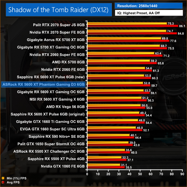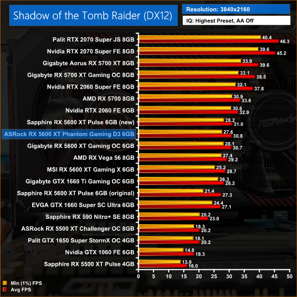While Red Dead Redemption 2 may be a strong game for AMD, Shadow of the Tomb Raider swings the opposite way, though the margins are not as large – the ASRock Phantom Gaming is 2% slower at 1080p, and 3% slower at 1440p.