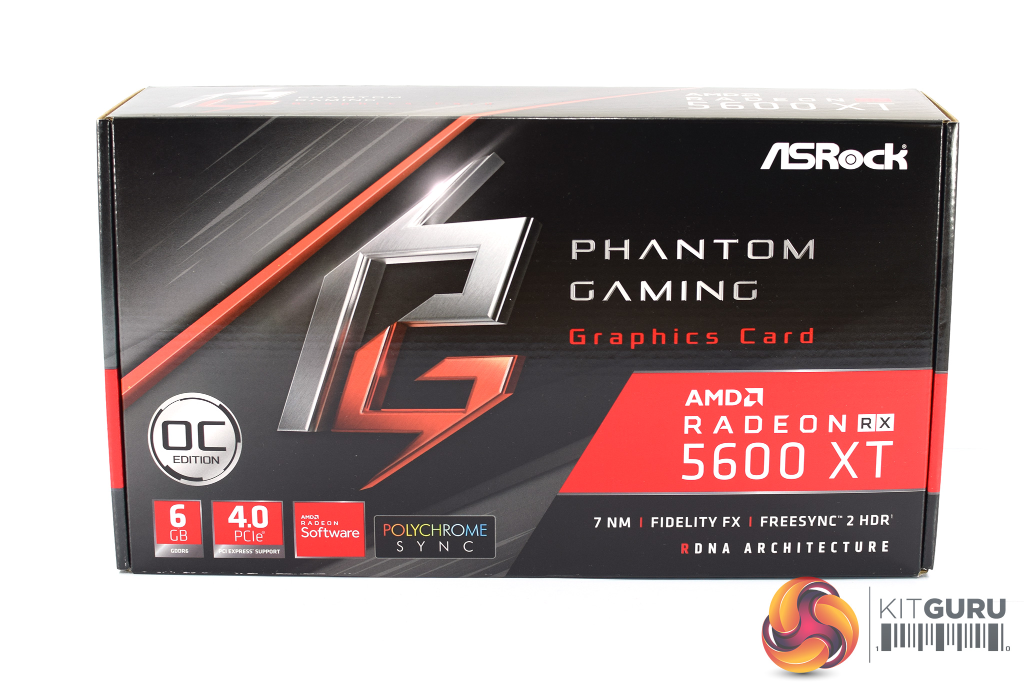 The ASRock RX 5600 XT Phantom Gaming D3 ships in a black box, with the large ‘PG' (Phantom Gaming) logo highly visible. There's no image of the card itself on the box.
