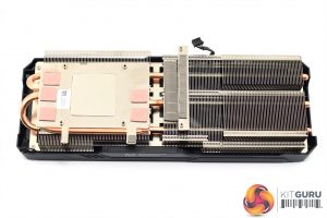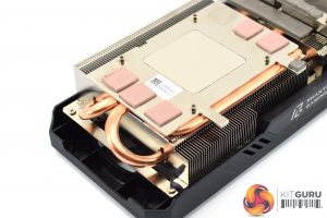 The cooler is comprised of two aluminium fin stacks, connected by three 6mm copper heatpipes. These don't make direct contact with the GPU die, however, as ASRock has fitted a separate plate for the GPU and VRAM, while there is another plate for the VRM as well.