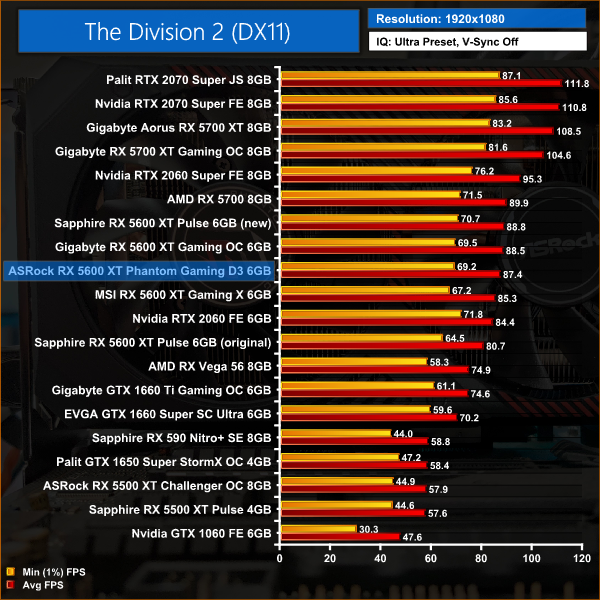 Next up is The Division 2, and at 1080p the Phantom Gaming 3 holds a 4% lead over the RTX 2060. There is, however, a 2% gap between the Phantom Gaming and the Sapphire Pulse, but that works out as just a 1.4FPS difference.