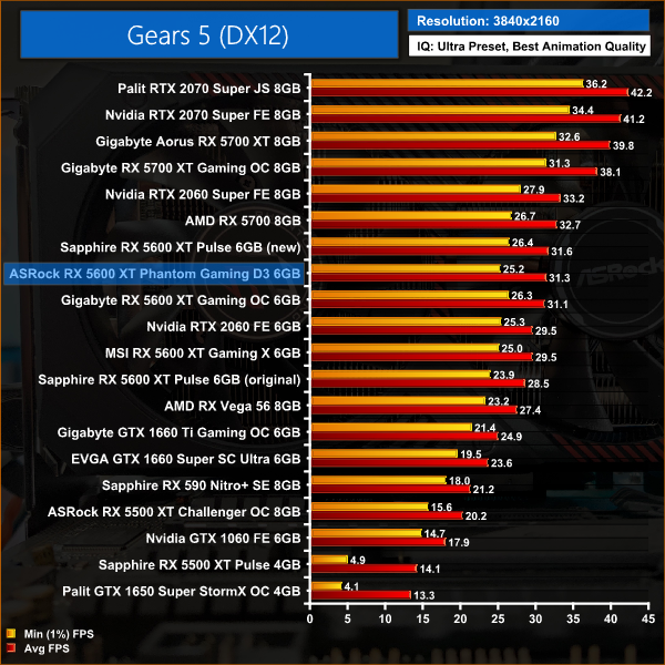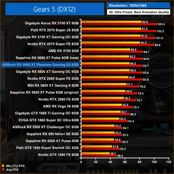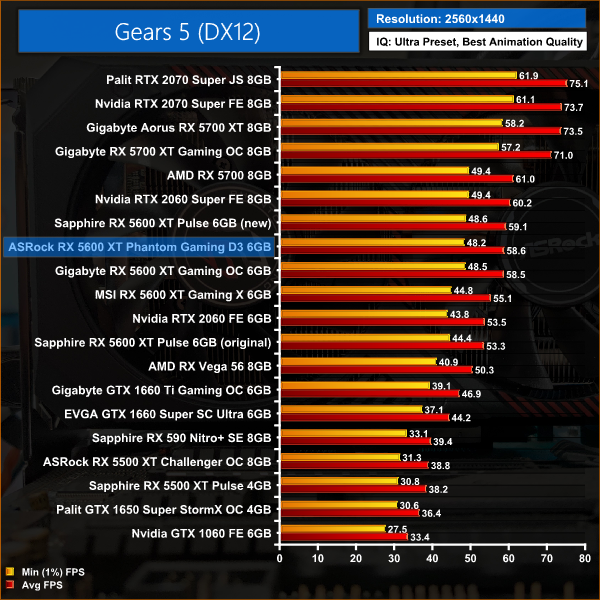 Gears 5 sees the RX 5600 XT take its biggest win over the RTX 2060 across all of the games we tested, with a 12% performance advantage at 1080p. At this resolution, the Phantom Gaming is neck-and-neck with the Sapphire Pulse, but 6% faster than the MSI Gaming X.