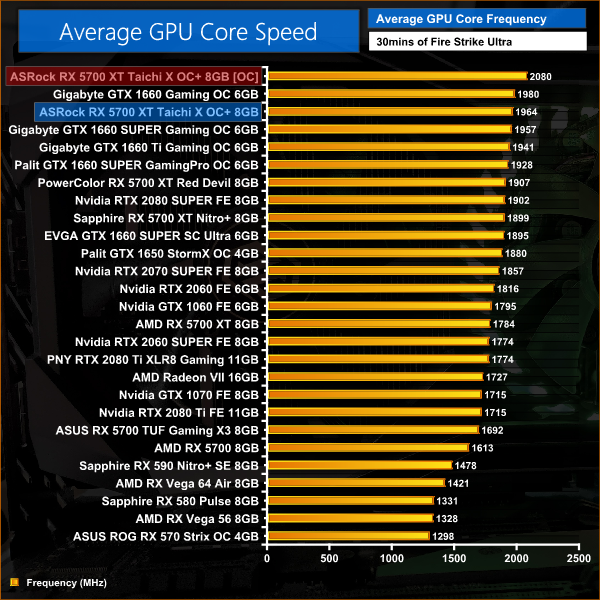 This saw our average clock speed rise to 2080MHz, a 6% increase over stock behaviour with the OC BIOS.