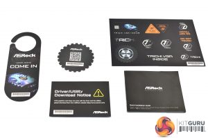 Inside, there are a number of accessories, including: a door hanger, quick start guide, a selection of stickers, a reminder to download the latest drivers, plus a coaster with a QR code on it which takes you to asrock.com.