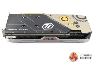 Additionally, we can also get a look at the Taichi's backplate. This is a full-length metal design, and it is quite visually appealing. It has a two-tone appearance, with about two thirds of backplate being black, brushed metal – with the other third a grey/beige sort of colour. This section also sports two metal cogs, which sit below the backplate itself, which ASRock calls the ‘3D' backplate design.