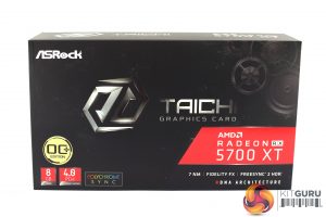 The ASRock RX 5700 XT Taichi X OC+ ships in a black box, with the Taichi logo and cog and gear styling visible on the front, but there's no image of the card itself.