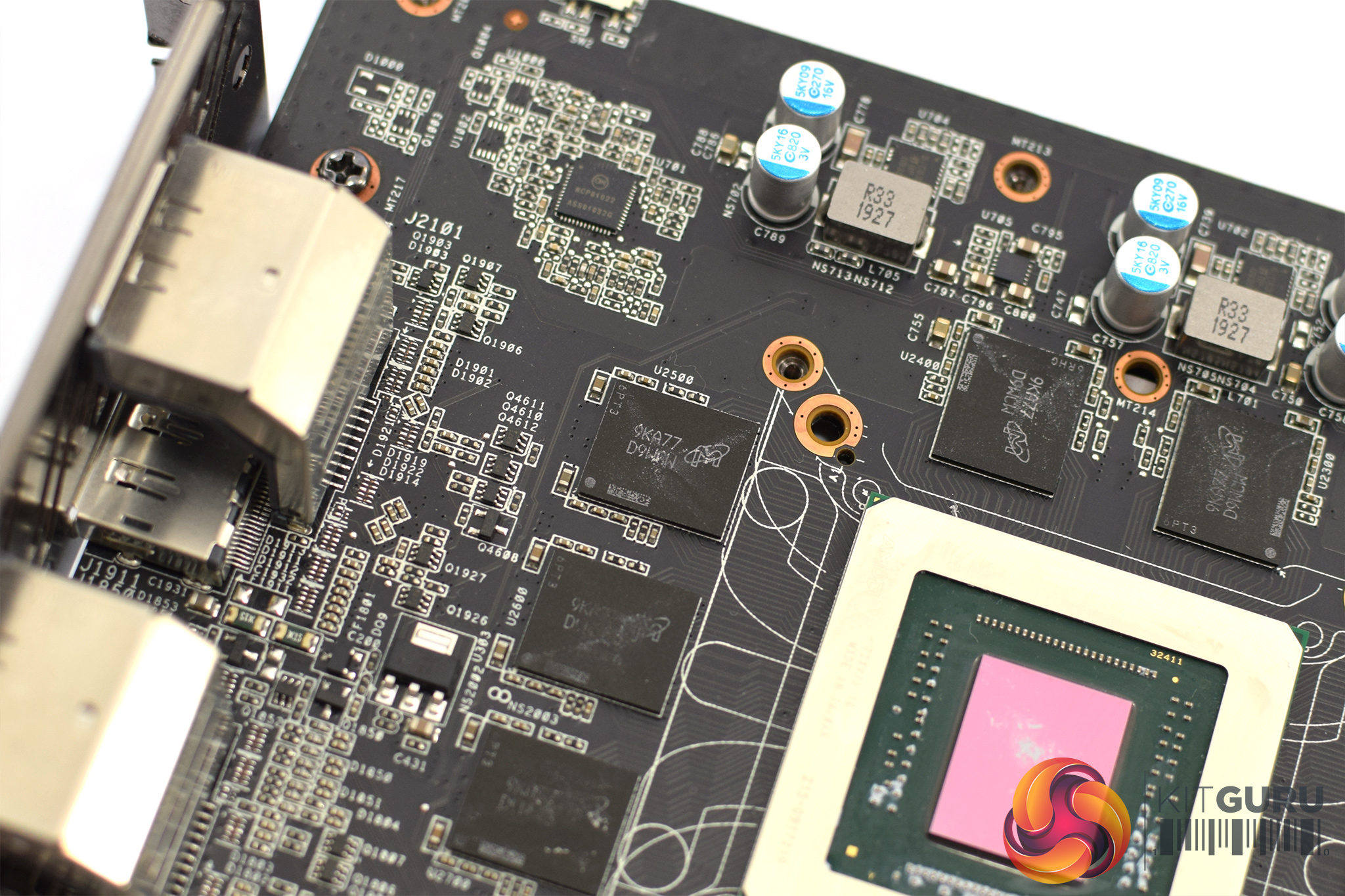 Once that frame is removed, the bare PCB is exposed and we can see ASRock has opted for a 10+1 phase VRM for the GPU, and a 2-phase VRM for the memory. The memory modules themselves are from Micron, each chip is labelled ‘9KA77D9WCW'. Lastly, we can also see the 251mm² Navi 10 GPU sitting in the middle of the PCB.