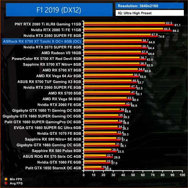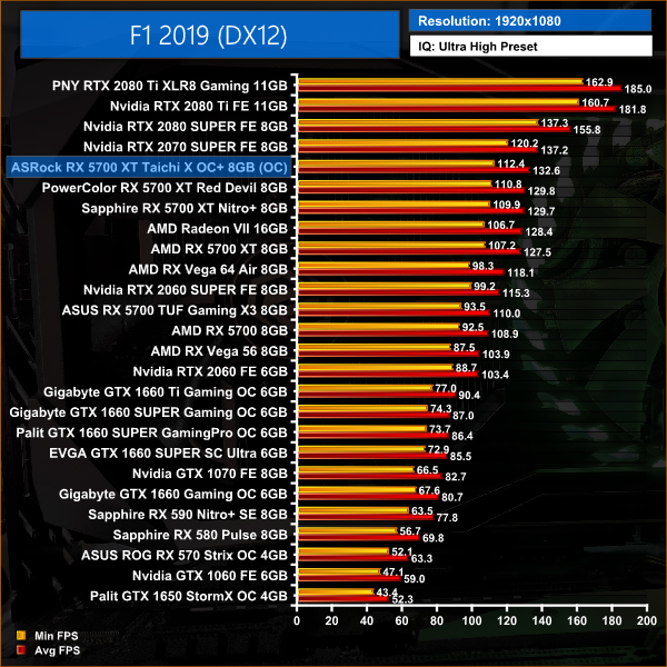 F1 2019 is another title where we see decent gains with the Taichi X versus the reference card, with a 6% performance difference at 1440p. At the same resolution, the Taichi outperforms the Nitro+ by 3%.