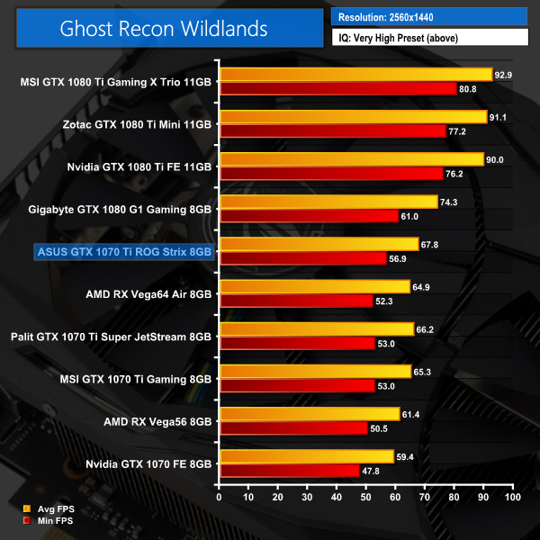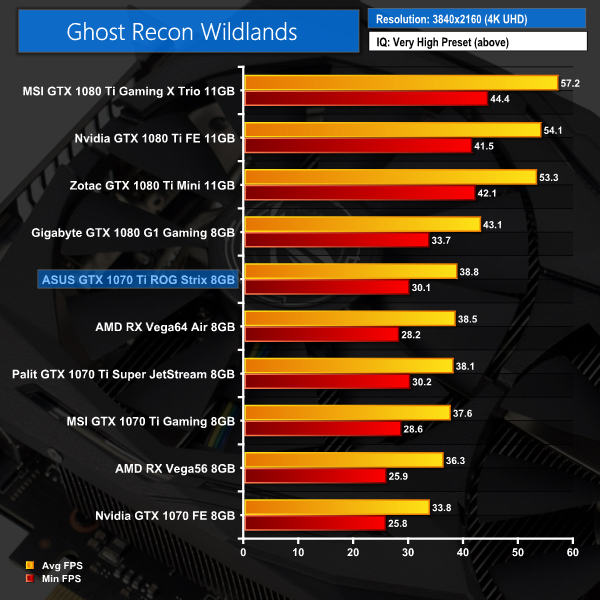 Wildlands does favour Nvidia hardware, so here we see the Strix 1070 Ti ahead of both Vega56 and Vega64. It also delivered better frame rates than its rival 1070 Ti partner cards.