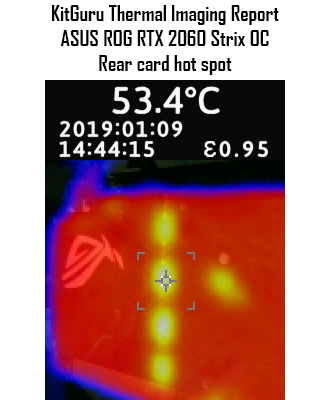 The low temperatures continue when we look at the card with our thermal imaging camera. Here, the hottest spot on the card itself didn't even reach 54C, which only goes to show how well the Strix cooler is able to disperse the heat produced by the card.