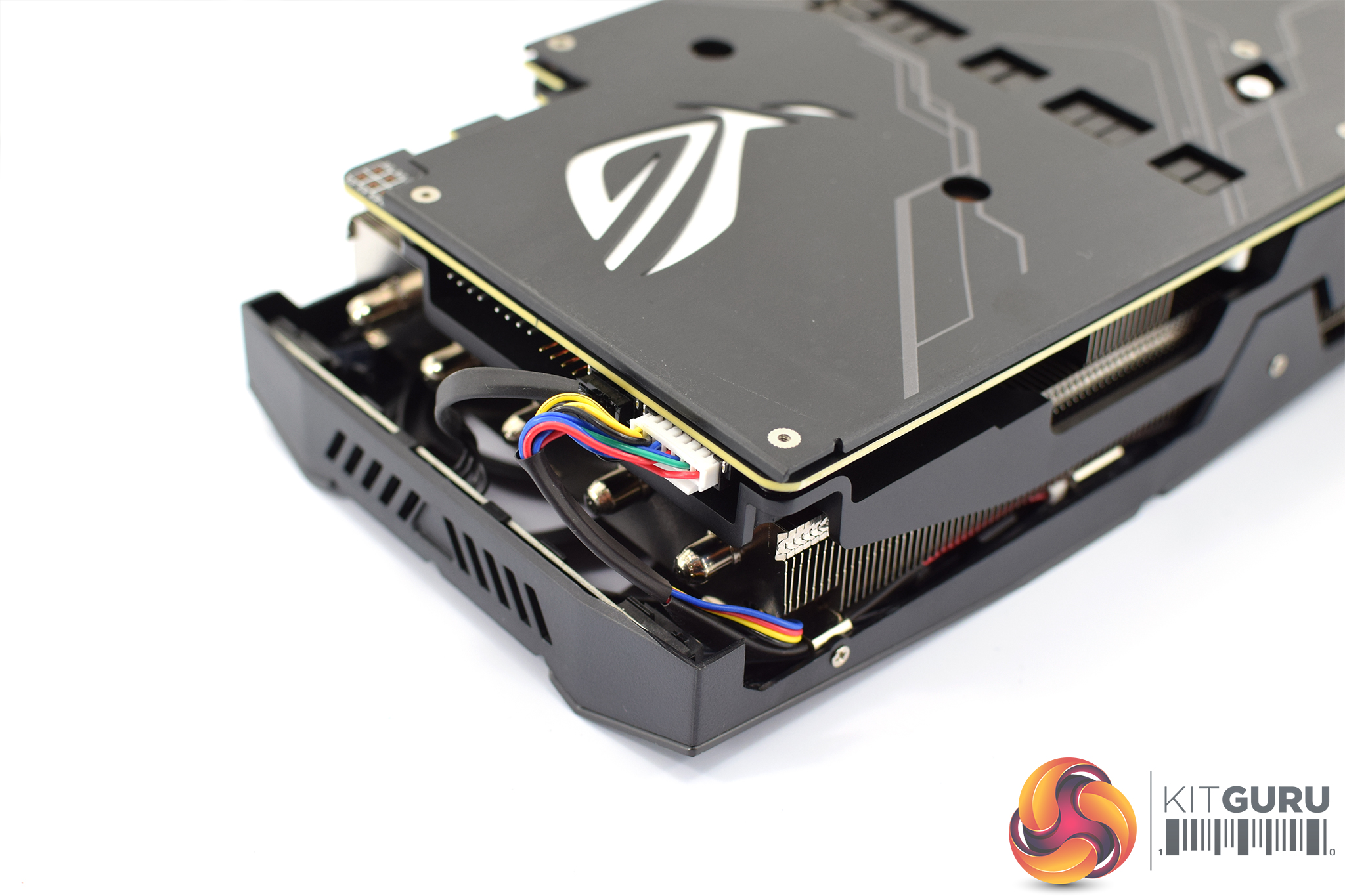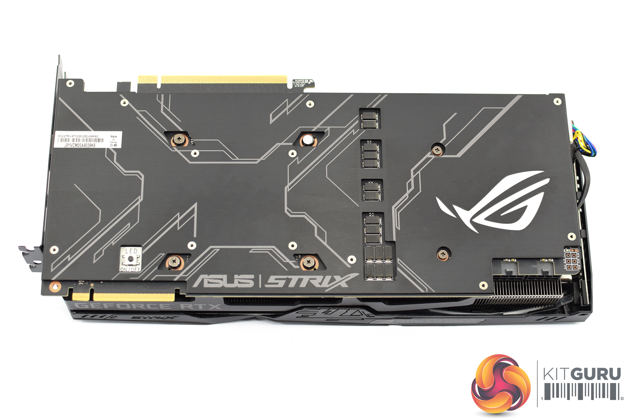 The brushed metal backplate is very easy on the eye, with some white lines to add a bit of interest. The ROG eye logo on the right-hand side of the card is again illuminated by RGB LEDs.
