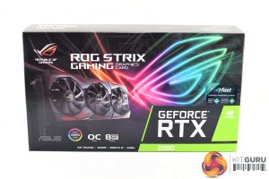 The ASUS ROG RTX 2080 Strix OC ships in a black box with a large multi-colour ROG logo dominating the front. An image of the graphics card itself occupies the left-hand side of the box.