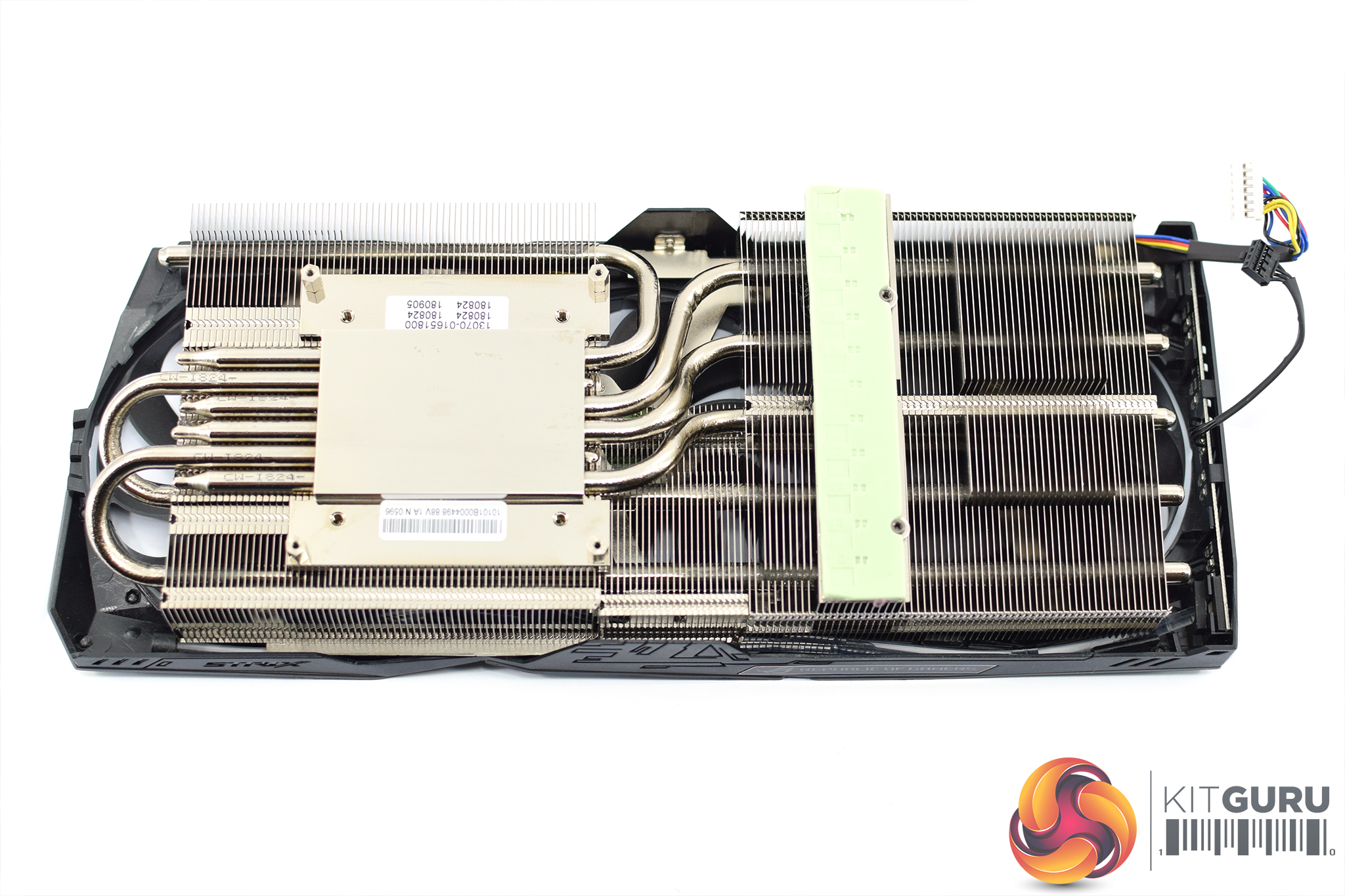 The heatsink itself makes use of 6 nickel-plated heatpipes which draw heat away into a fin array that ASUS says has 20% larger surface area than the previous generation of Strix cards. This helps explain why this Strix RTX 2080 is a 2.7 slot card, when the Strix GTX 1080 Ti was ‘only' a 2.5 slot card.