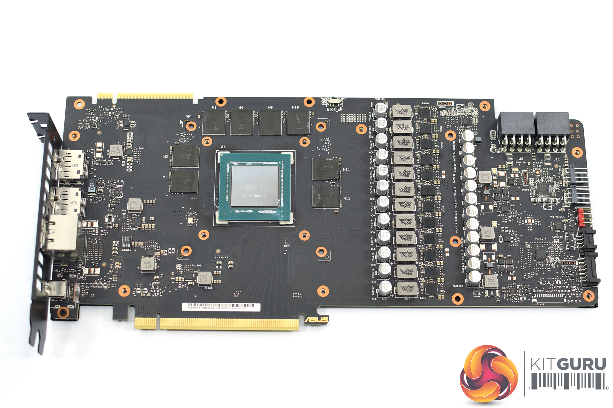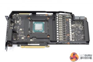 Once that is removed, we get a clear look at the PCB. This is a custom job from ASUS with an improved 10+2 Super Alloy Power (SAP) II phase design, while ASUS claims its SAP II capacitors offer over 90,000 hours longer lifespan than traditional capacitors – though that obviously goes well beyond the scope of this review!