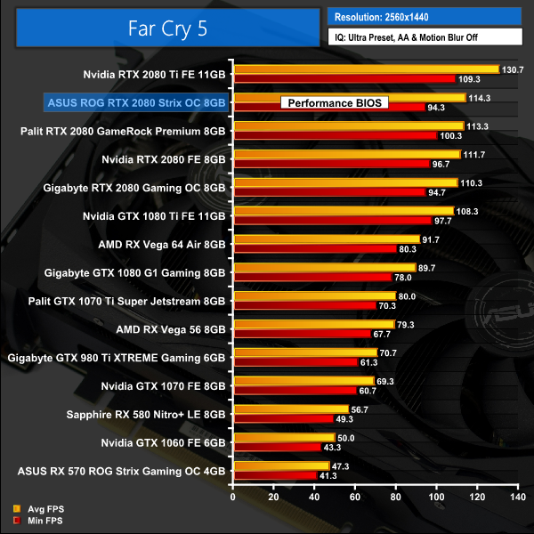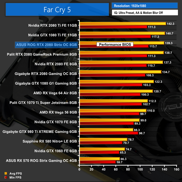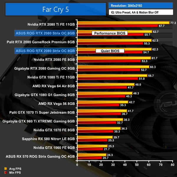 The ASUS Strix once again edges ahead of the other RTX 2080 cards when we get to Far Cry 5. While it is the fastest card here, the margins are not big – there's only 2.4FPS between the top and bottom RTX 2080 cards at 4K.