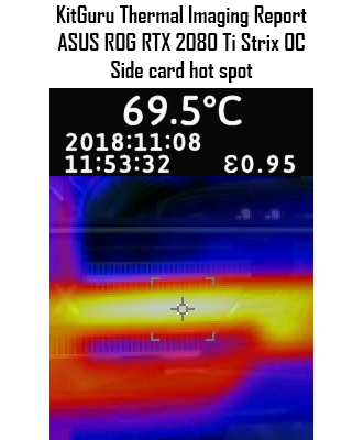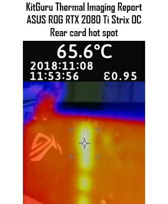 In terms of our thermal imaging, results are again excellent. We saw a peak of 69.5C on the side of the card, and the peak of 65.6C on the back was from an area of exposed componentry that was not covered by the backplate.