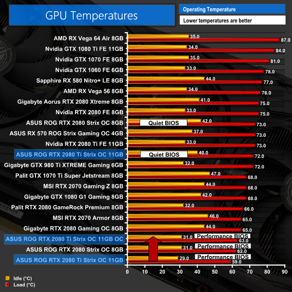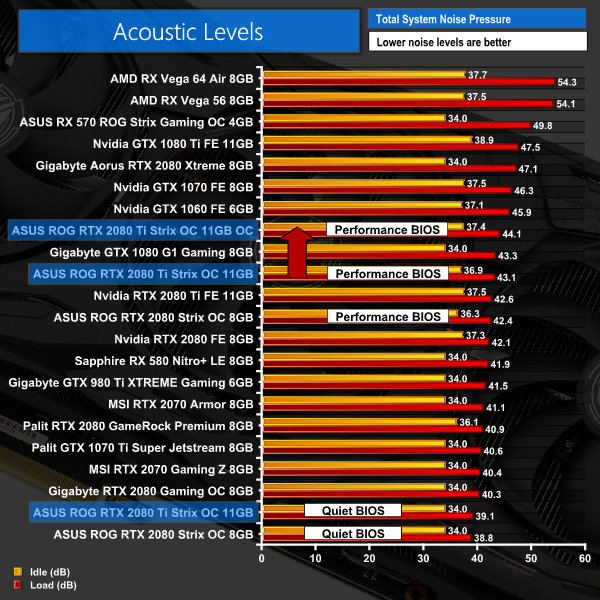 As expected, this card does run both hotter and louder when overclocked. The GPU core increased 4C, from 59C to 63C, but we have to remember that is still one of the coolest resulted we have seen, even with an overclock applied. Noise levels only rose 1dB, too, which is not that noticeable in the real world. If we look at power consumption, this jumped up 35W or so – taking it past stock Vega64 – but again, that is not a big concern for me.