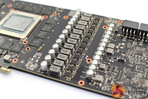 One of the last things to mention are the 2x 8-pin PCIe power connectors that are required to power this card, and we can also see that ASUS has tweaked the display outputs over reference, with 2x HDMI 2.0b ports, 2x DisplayPort 1.4 and the USB-C connector present.