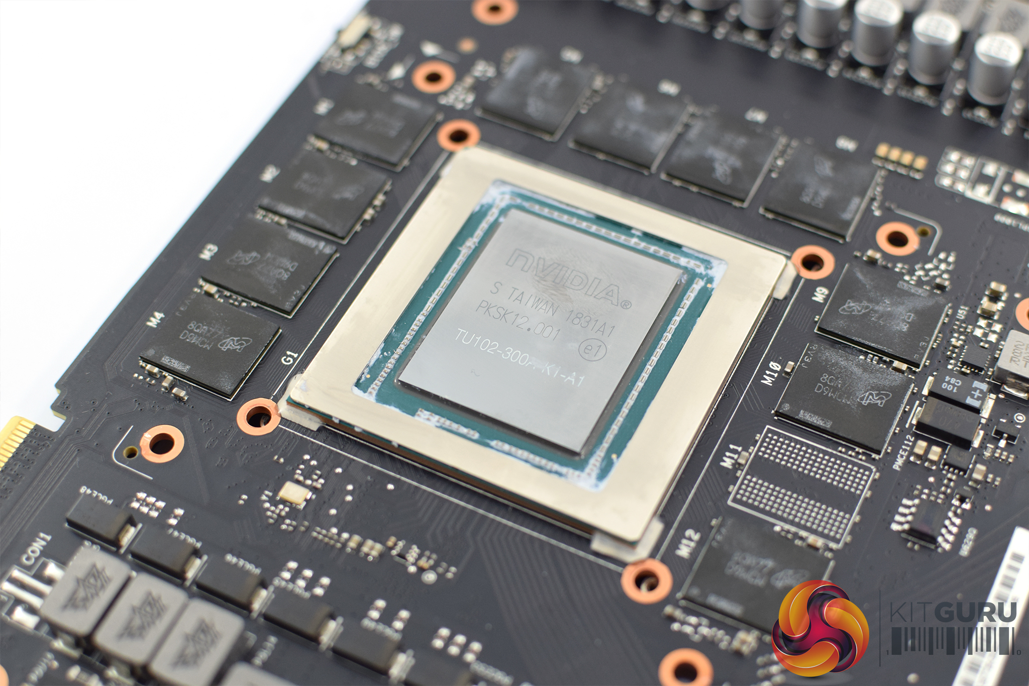 Elsewhere, our 11GB of GDDR6 memory comes from Micron, with the chips labelled ‘8QA77D9WCW'. The RTX 2080 Ti uses the TU102 GPU, and this is labelled ‘TU102-300A', with the ‘A' designating that this is a binned chip suitable to be sold with a factory overclock.