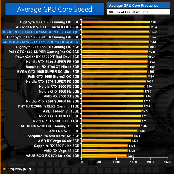 Starting our look at the dual-BIOS testing, there really isn't much between both the Q BIOS or the P BIOS in terms of average clock speeds. Both see the GPU run at over 1950MHz – a great result for out of the box speeds – with the Q BIOS running just 8MHz slower. This suggests to me that the Strix is likely going to be one of the fastest 1650 SUPER cards we will see.