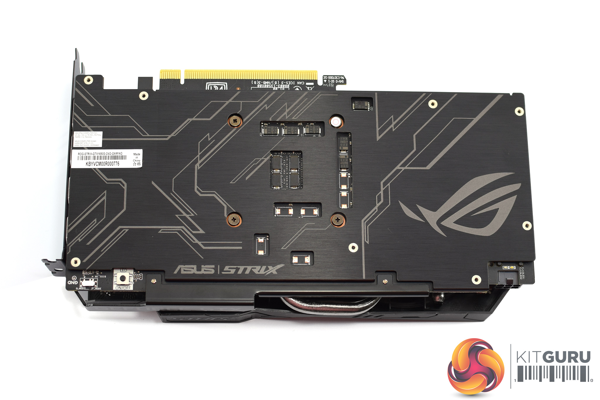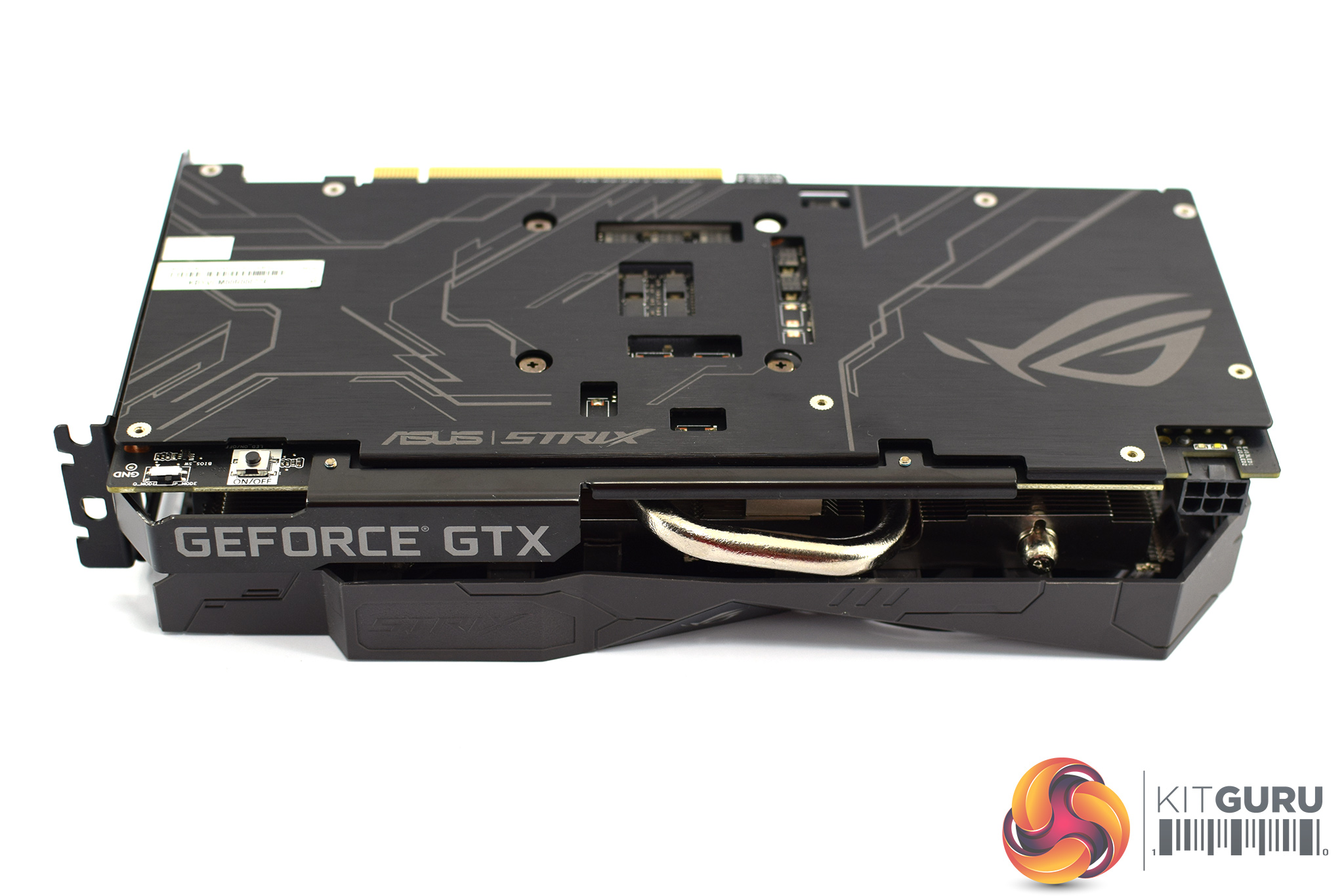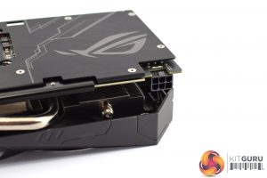 When viewed from the side, we can see a couple of exposed heat pipes just above the PCIe connector – but we take a closer look at the heatsink/cooler below. Elsewhere, the small ROG logo positioned on the side of the shroud is the only RGB zone on this card.