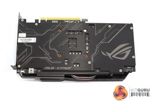 As for the card itself, we got our first look at this model during our recent unboxing, but it's worth pointing out a few elements of the design. The first is the matte-black plastic shroud that we are very familiar with – it's a very similar look to other Strix cards we have reviewed in the past year. It isn't overly aggressive, but the sharp angles and edges do give it a bit of a ‘gamer' aesthetics. It's entirely matte black though, so colour coordination won't be a problem with this card.