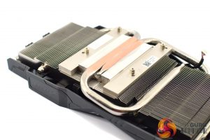 As for the cooler, this uses a single fin stack with 2x 8mm heatpipes. These pipes make direct contact with the GPU die, but there's no extra coldplate for the VRM or memory modules. Two memory modules are covered with a thermal pad that contacts with two of the heatpipes, but the other two modules make no contact with anything. If this was a high end card, this would be much more of an issue, but on the lower-end boards the VRM and memory can get by with less active cooling. I'd still rather all the components made proper contact with the heatsink, however.