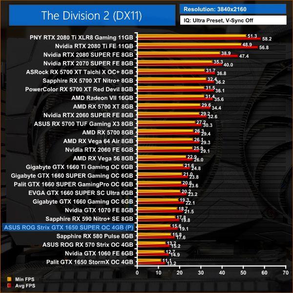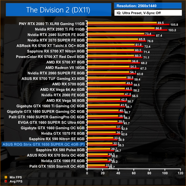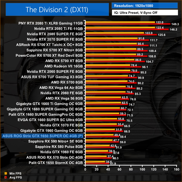 The Division 2 is a more favourable comparison for the 1650 SUPER, coming out slightly faster than the RX 590 at 1080p. Compared to GTX 1660, it is 11% slower in this title.