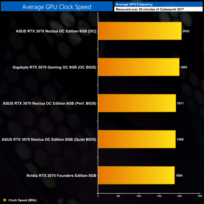 This resulted in a new average clock speed of just over 2052MHz, a 7% increase over stock clocks.