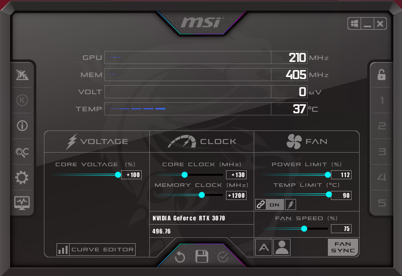 For our manual overclocking tests, we used MSI Afterburner. Our best results are as below, with +130MHz to the GPU and +1200MHz to the memory.