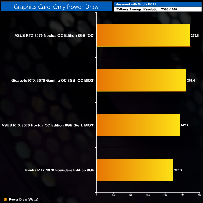 Lastly, power draw did also bump up when manually overclocked, up to a new average of 272.8W, a 12.6% increase compared to the out of the box power draw.