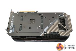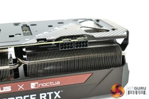 As for the backplate, this is a full-length metal design, but with several cut-outs behind the capacitors on the back of the PCB. We can also note the beige stripes towards the end of the backplate, to give it some Noctua flair, as well as the ASUS x Noctua logos.