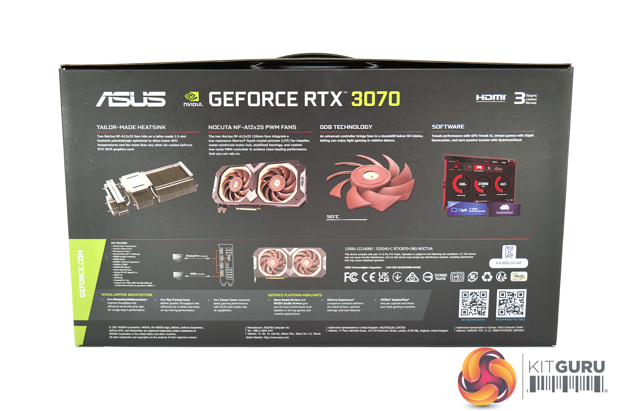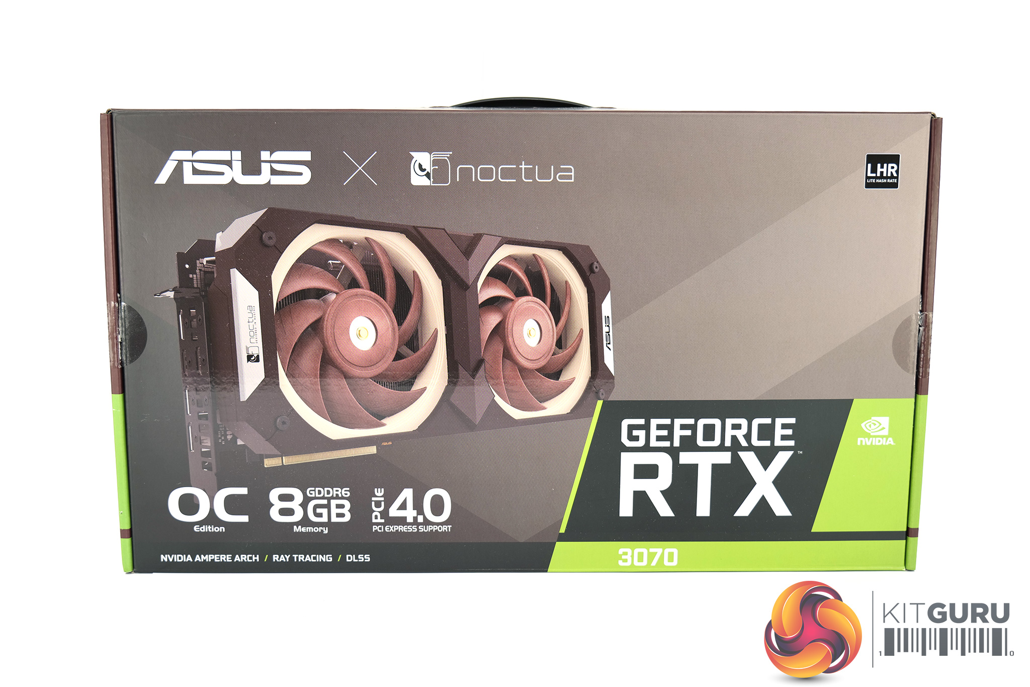 The ASUS RTX 3070 Noctua Edition immediately sets the tone for what we should expect, with its dark brown colouring and a large image of the card itself.