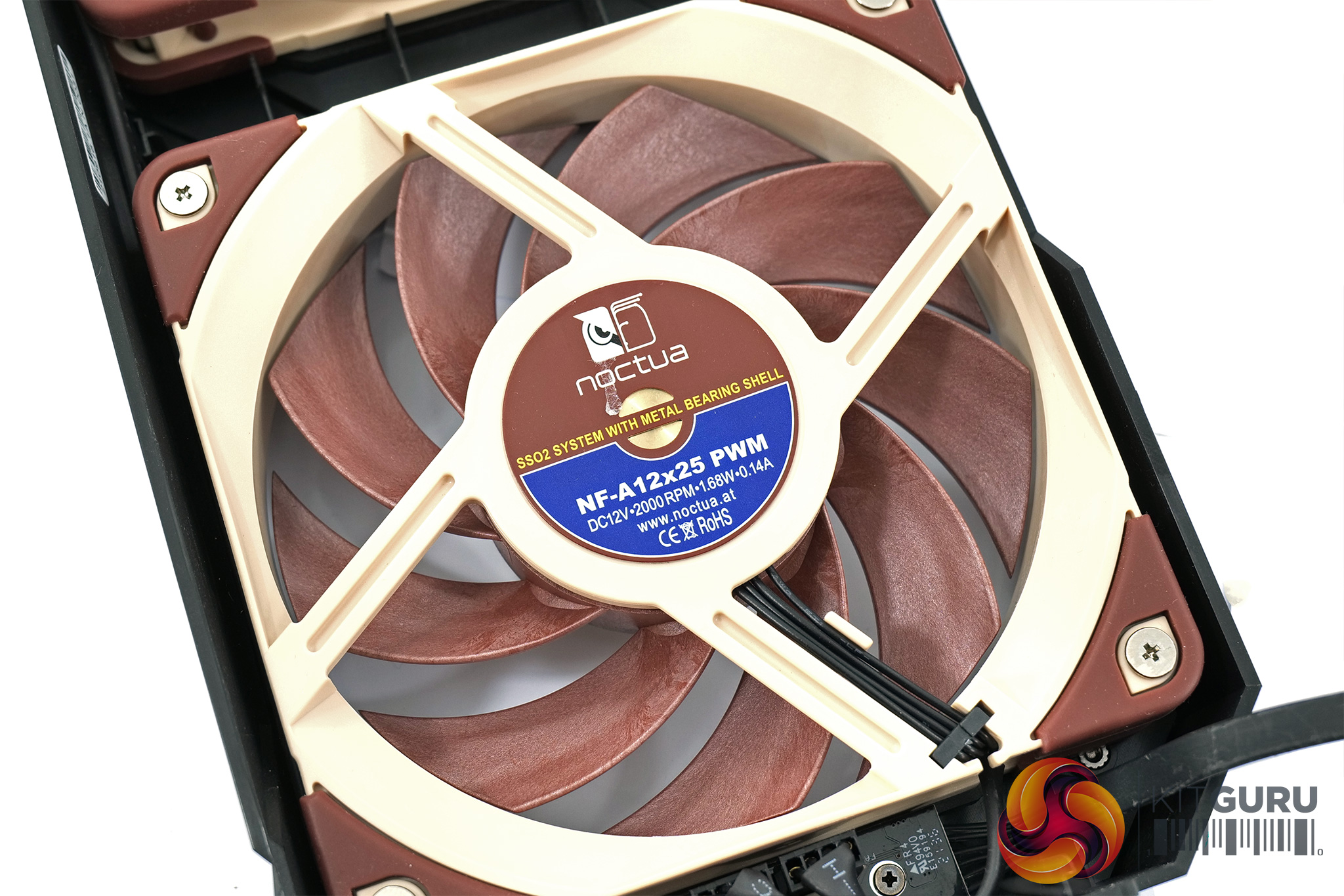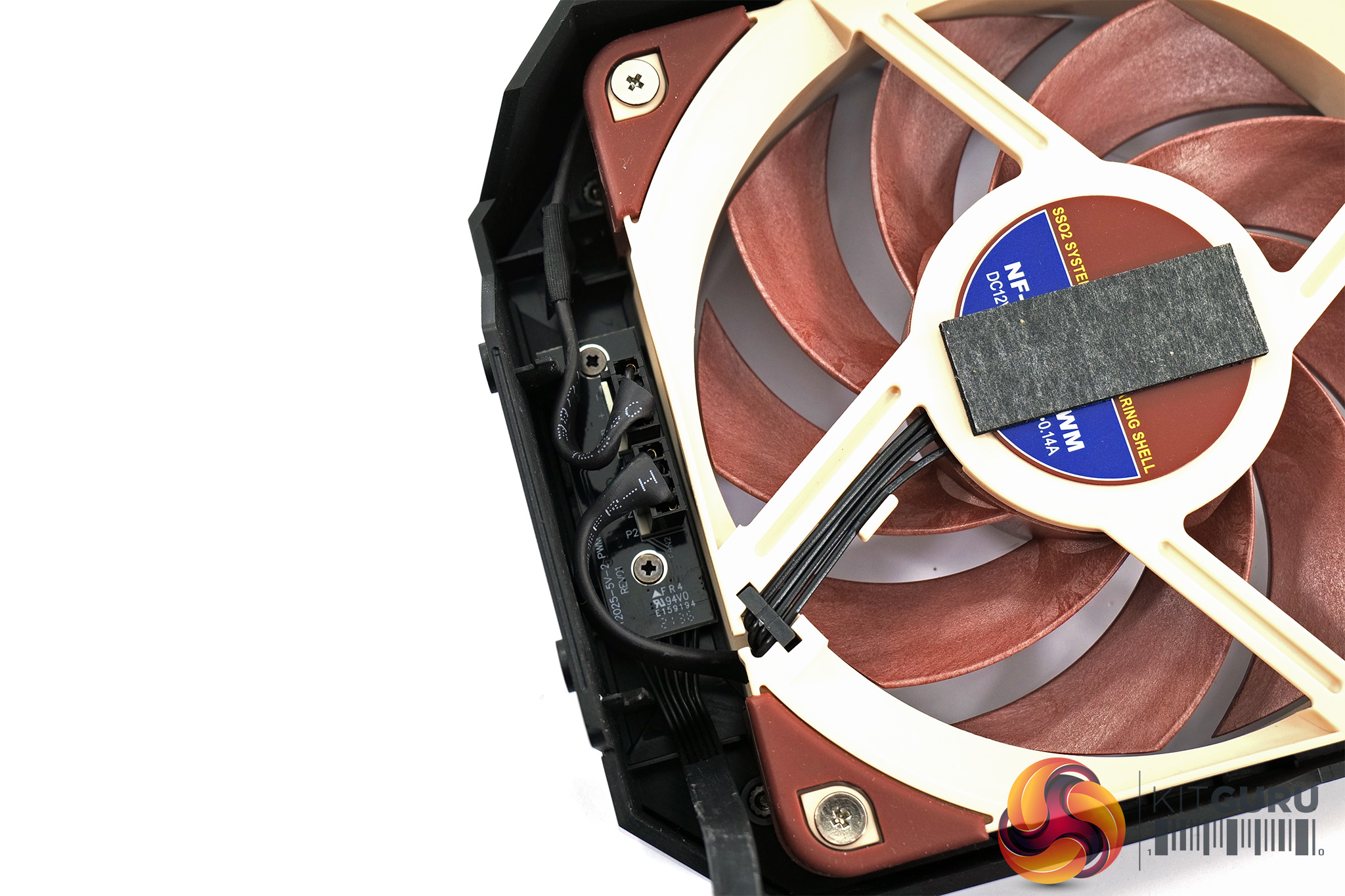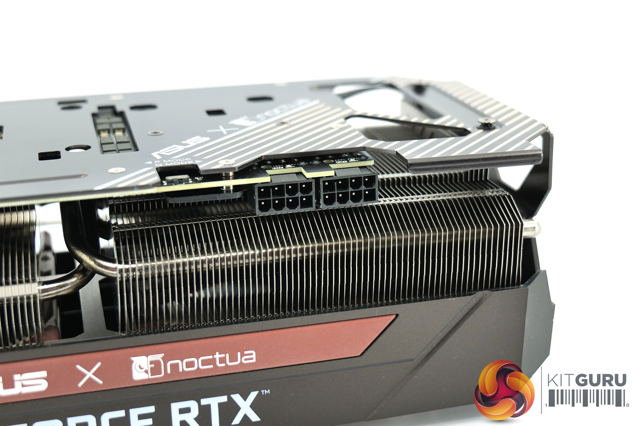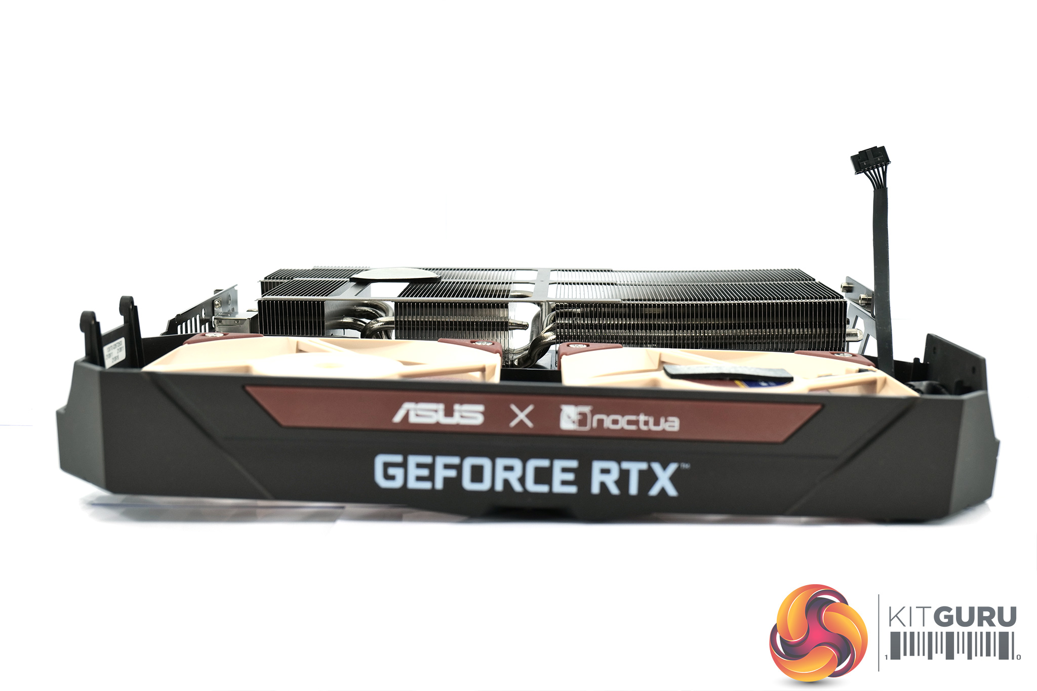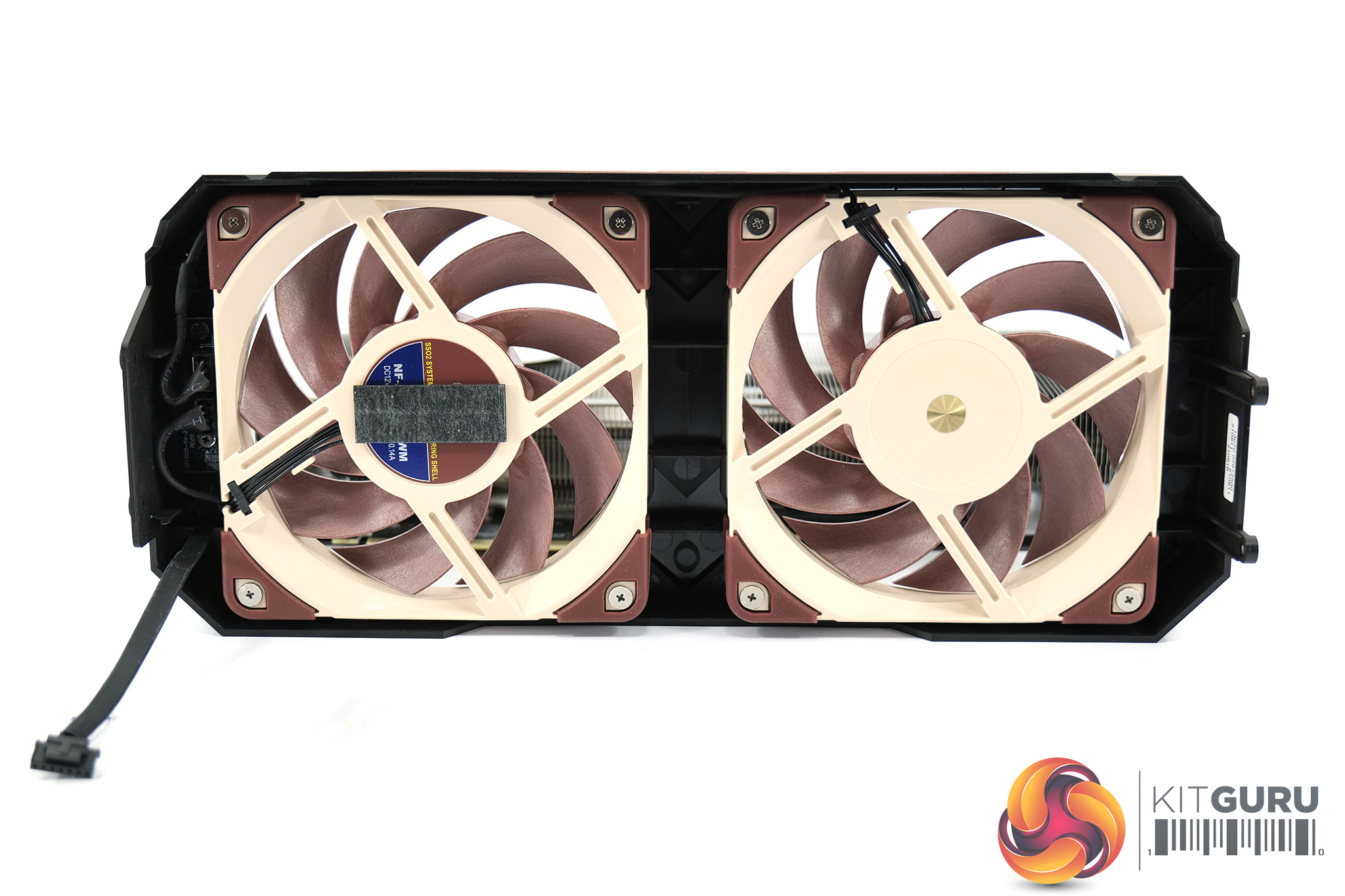 Taking a closer look at the cooling setup, in the images above we removed the fan shroud which is held in with two screws at either end of the card. This clearly shows Noctua is using standard 120mm fans, specifically NF-A12x25, and you could even swap these out for different 120mm fans if you felt so inclined – the PWM fan headers connect to a small hub in the shroud, which then uses a proprietary connection to the GPU PCB itself.