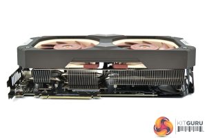 With the shroud removed, we can also get a better understanding as to why this card is so thick. It may sound obvious, but a lot of the card’s thickness is just due to those 120mm fans. Yes, the heatsink is bigger than normal as we will see below, but it’s not like most graphics cards where the fans are only as thick as the fan blades themselves. With the NF-A12x25, they’re in a standard 25mm thick frame.