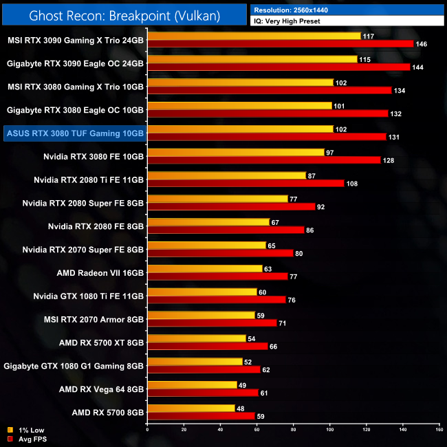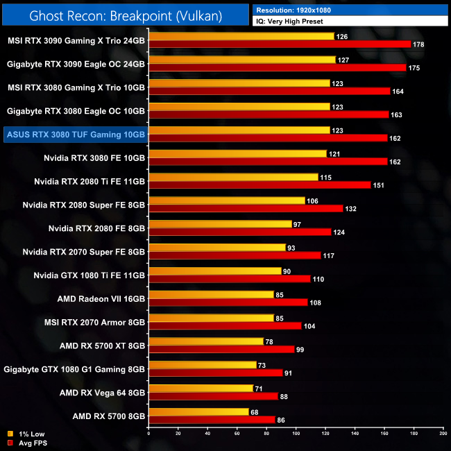 Ghost Recon: Breakpoint sees the TUF do a little better, relatively speaking, as it averages 77FPS at 4K. This is the same result as the Gigabyte RTX 3080 Eagle OC, putting both cards 3% ahead of the Founders Edition.
