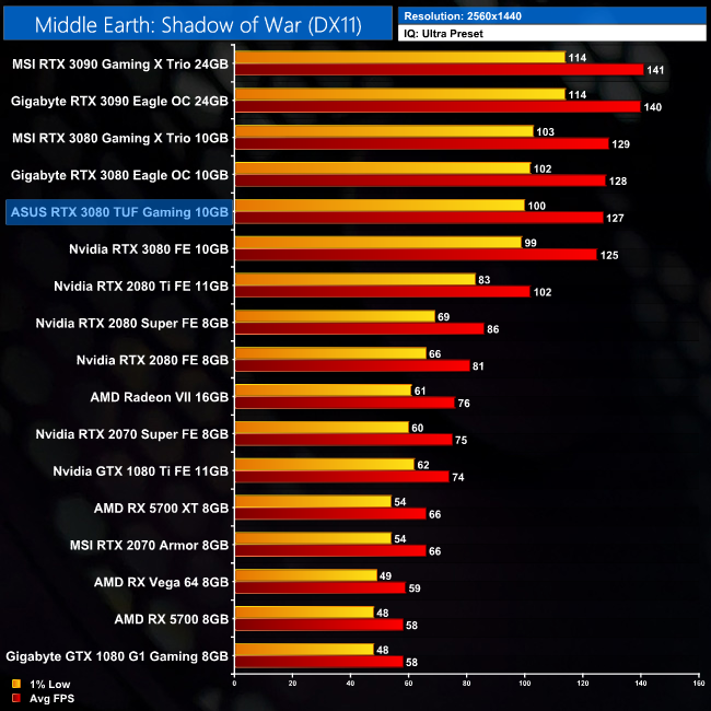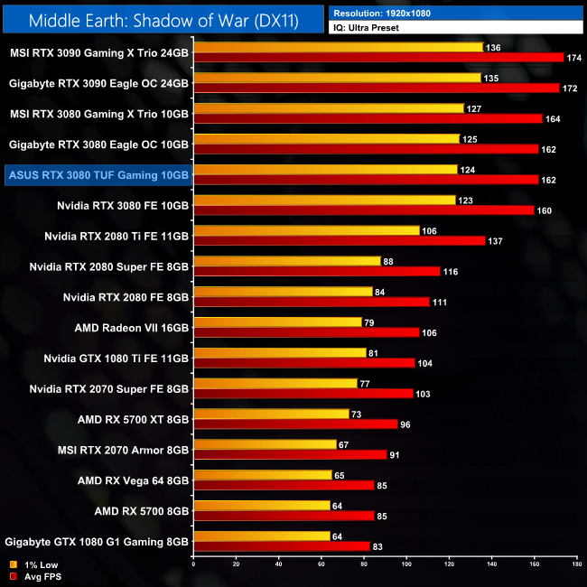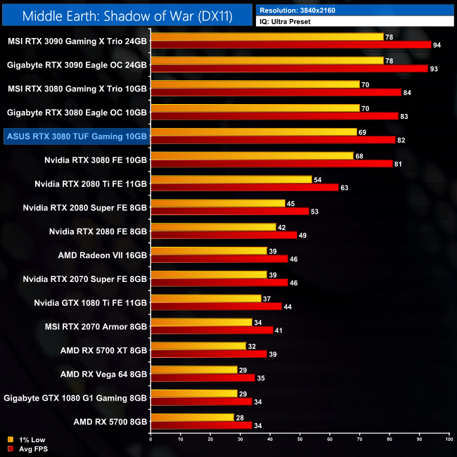 We're back to single-frame differences between the TUF Gaming and RTX 3080 Founders Edition when testing Shadow of War, at 4K.