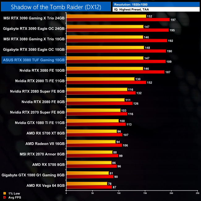 As for Shadow of the Tomb Raider, at 4K we see a 3% lead for the TUF Gaming compared to the 3080 Founders Edition, a difference of just 2FPS. The TUF is 37% faster than RTX 2080 Ti at this resolution.