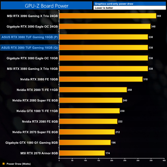 This is because both of the BIOS options have the same 340W power target, which is the same as the Gigabyte Eagle and MSI RTX 3080 Gaming X Trio models we have tested. Accordingly, board power for all three averages out to 338W.