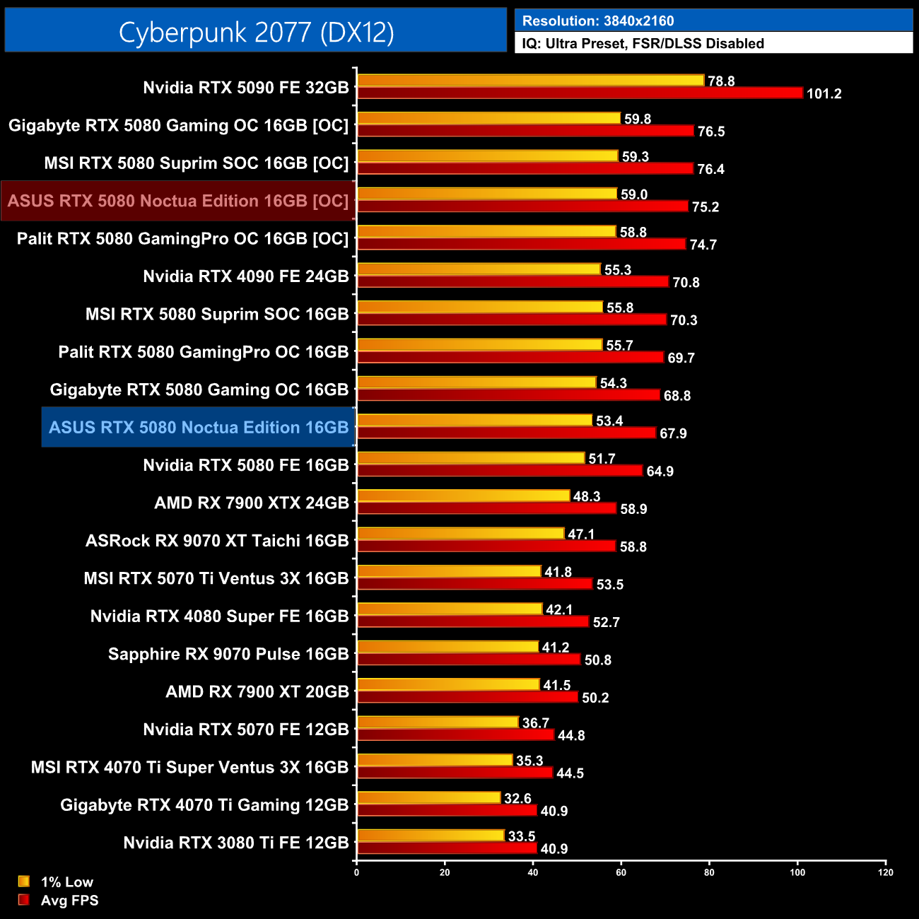 Overclocking the RTX 5080 is very straightforward. We maximised the memory slider at +2000MHz and also maxed out the power limit at 125%, for a 450W theoretical target. Our best result came with 375MHz added to the core – 400MHz was stable in Cyberpunk but crashed in A Plague Tale: Requiem, so I dialled it back slightly.