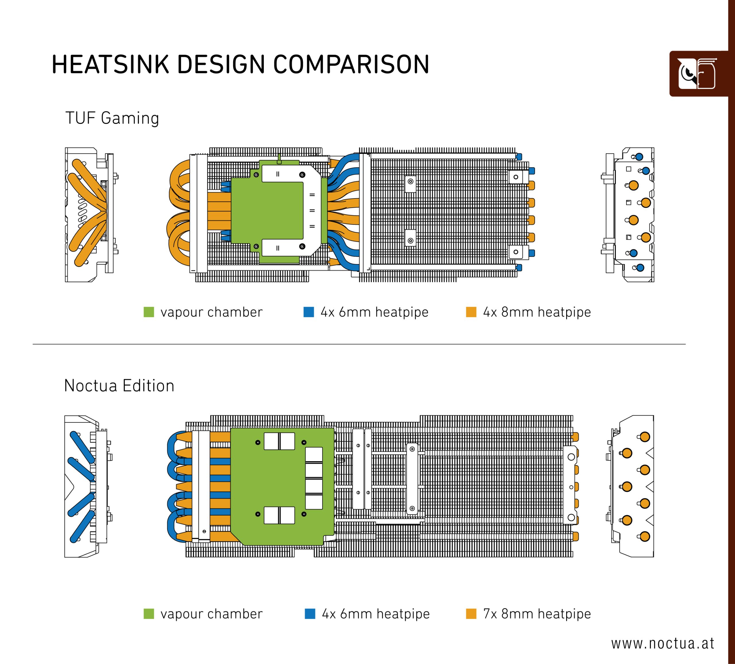 As for the heatsink itself, this is also based on the TUF model, but as you can see in the graphic kindly provided by Noctua, its cooling capabilities have been significantly enhanced. Not only does it now pack in eleven heatpipes, with 4x 6mm and 7x 8mm pipes, the heatsink itself is bigger, while the base plate has been expanded to help cool the memory modules too. And yes, it is also using a vapour chamber!