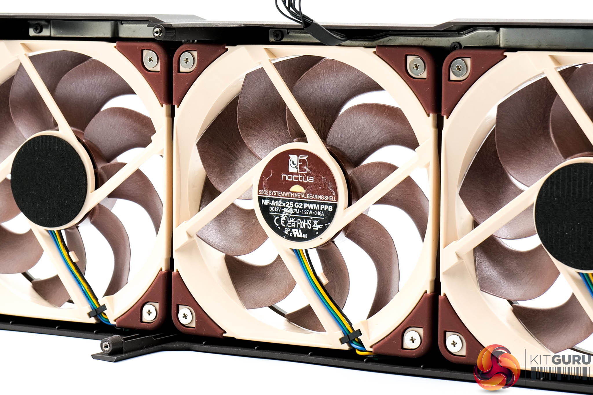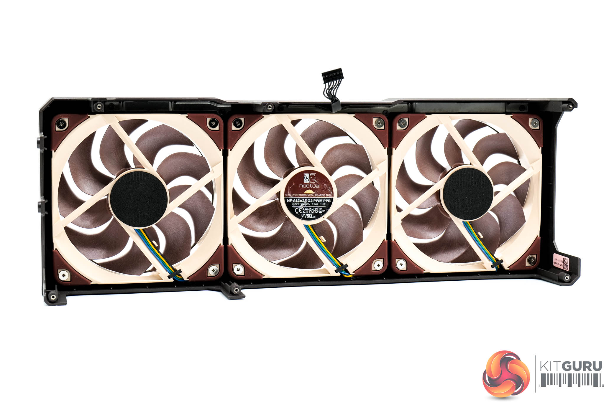 Then for what we are all here for – the card itself. It really is Noctua all over, with a brown shroud and the three 120mm NF-A12x25 G2 fans on show with the tan fan blades and beige frames. There's also a couple of grey strips in the shroud to help break things up a bit. I'm not really going to comment on the aesthetics themselves – you'll probably love it or hate it, but safe to say Noctua has enough supporters of its iconic colour theme, so I am sure plenty of people would love to have this card in their systems.