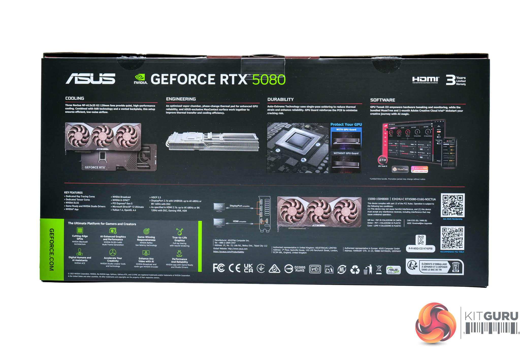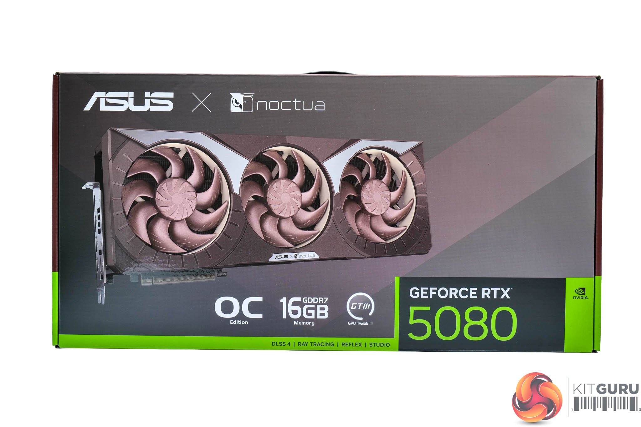 The ASUS RTX 5080 Noctua Edition ships in a large brown box, complete with an image of the graphics card visible on the front, along with the ASUS and Noctua branding.