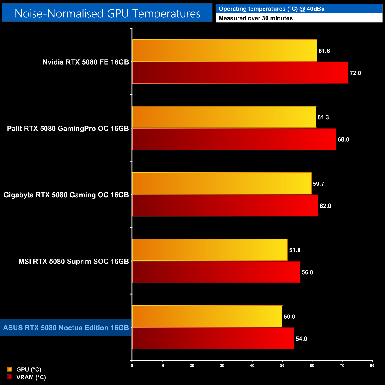 Following on from our stock thermal and acoustic testing, here we re-test the operating temperature of the GPU, but with noise levels normalised to 40dBa. This allows us to measure the efficiency of the overall cooling solution as varying noise levels as a result of more aggressive fan curves are no longer a factor.