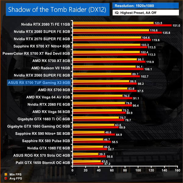Despite again falling behind 2060 SUPER in Shadow of the Tomb Raider, it's another 2% win for the TUF Gaming card when compared to the reference 5700.
