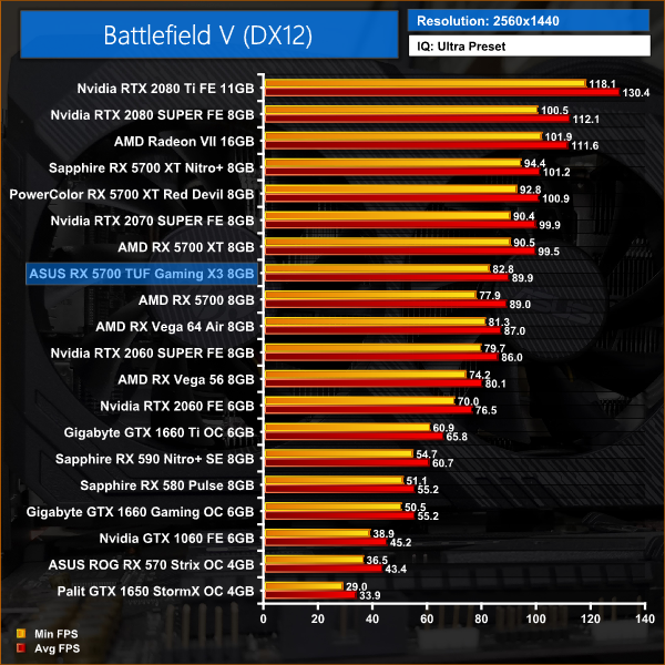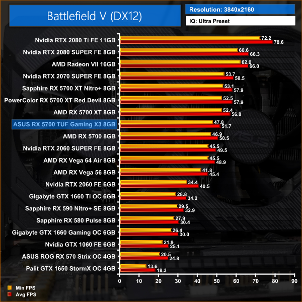 There's very little between this ASUS card and the reference design in Battlefield V, especially at 1080p where just 0.3FPS separates the two. The TUF Gaming does prove 2% faster at 4K, however.