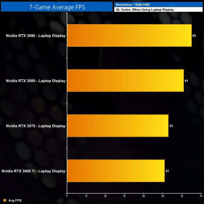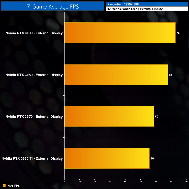 Grouping both 1080p charts together, if for whatever reason you cannot use an eGPU with an external monitor, a decent level of performance is still on offer from the four GPUs tested. However, we can clearly see little benefit to the using the RTX 3070 over a RTX 3060 Ti, and I’d say the same for the RTX 3090 instead of an RTX 3080 – Nvidia's flagship GPU is 7% faster, but that’s just a difference of 4FPS on average.