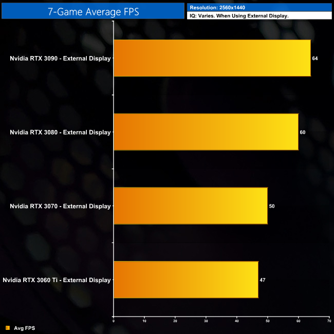 If you want to use an external monitor for eGPU gaming at 1440p, once more the biggest gap between the GPUs is with the RTX 3070 and RTX 3080, with the latter of the two proving 20% faster on average. The RTX 3090 is still just 7% faster than the RTX 3080, while the RTX 3070 is 6% faster than the 3060 Ti. That means we are seeing a difference between the four GPUs on test, but the margins aren't as large as you'd expect on a desktop.