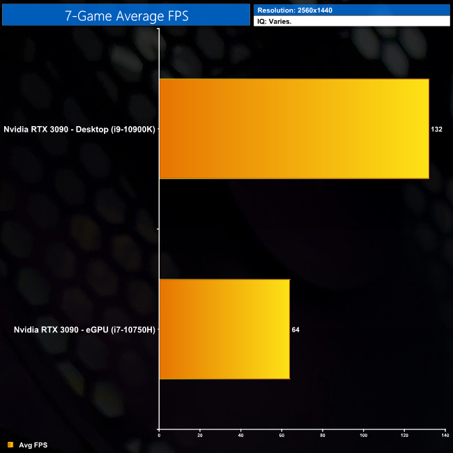 And then at 1440p, the RTX 3090 in our EG200 averaged 64FPS. Our desktop system however, it averaged 132FPS, so once again, the eGPU RTX 3090 loses over half the performance when compared to a desktop PC.