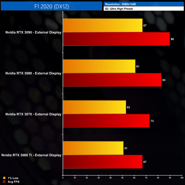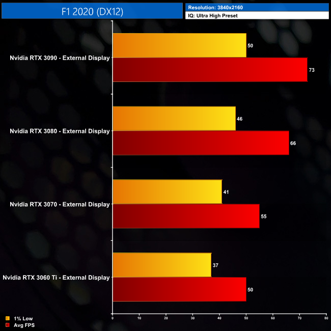 The results from F1 2020 once again show a clear benefit to using an eGPU with an external monitor. The RTX 3060 Ti, for instance, is 10% faster on an external screen than it is using the integrated laptop display. Another way of putting it is that the RTX 3070, when using an external monitor, is only 4% slower than the RTX 3090 when that GPU is using the laptop screen.