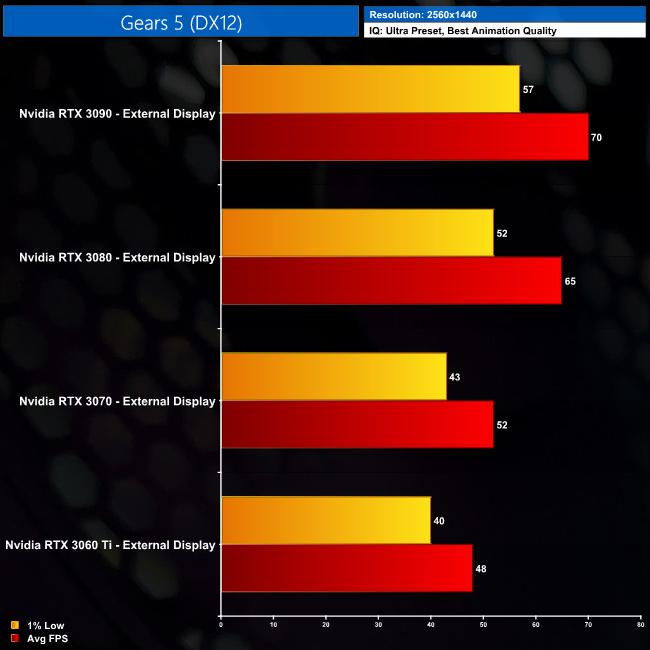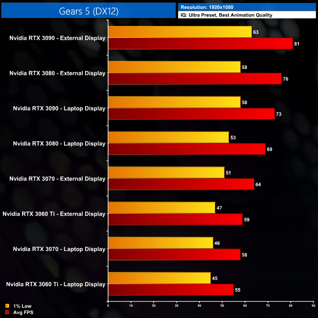 Next is Gears 5. We’re starting to see a pretty clear trend by now, that the GPUs are typically 10% or-so faster when using an external monitor, when compared to using the Blade 15’s own screen. This is perfectly illustrated by the RTX 3070, which delivered 64FPS on our external monitor, compared to 58FPS using the laptop display.